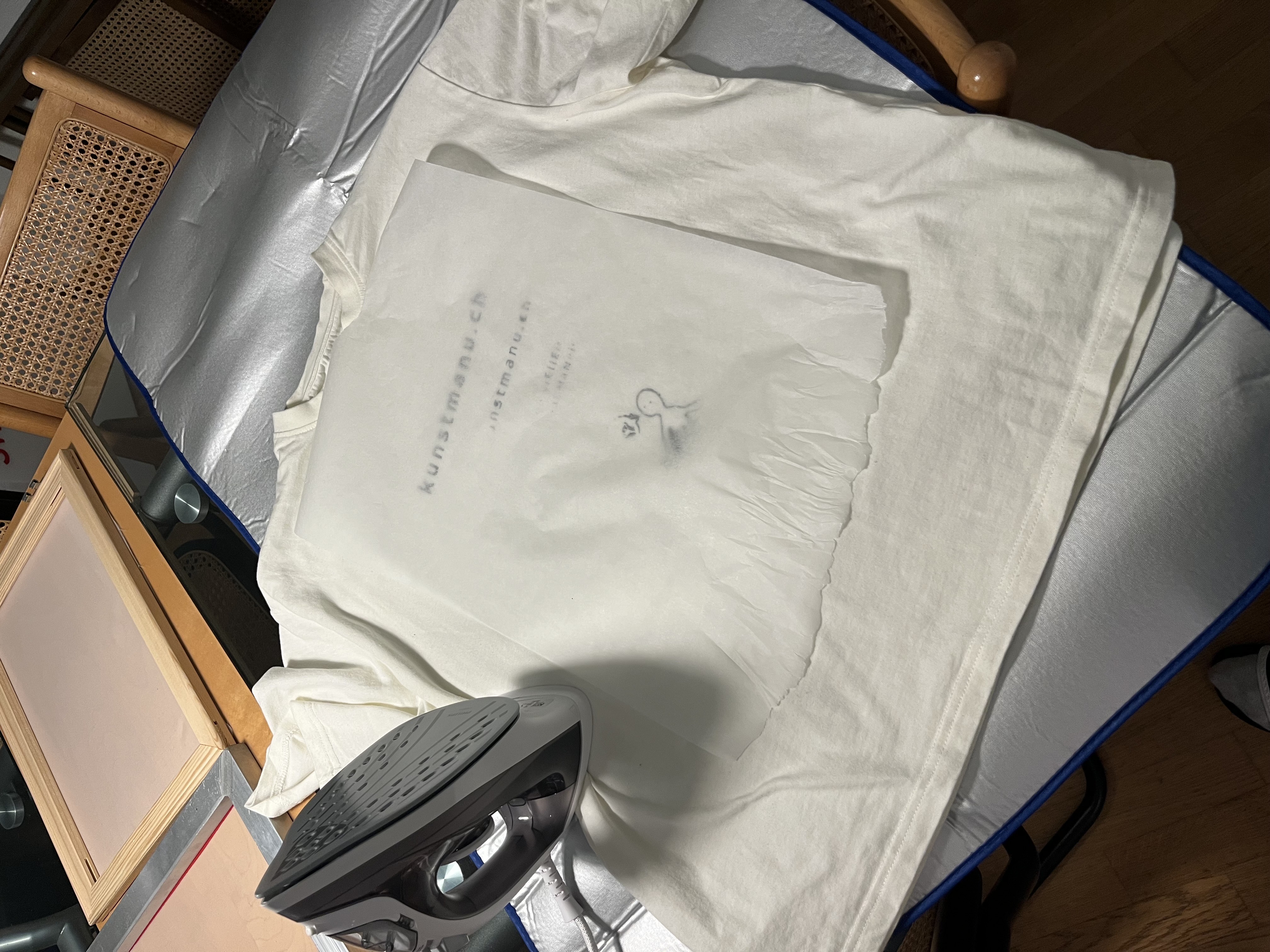 Der 1. Druckversuch. Ich habe mich entschieden, das 1. Sieb, trotz sehr unvollständiger Abbildung meiner Sujets, genau so zu drucken. Das hat geklappt. Dann Farbe fixieren mit der Heissluftpistole, Temperatur unklar, deshalb dann zur Sicherheit nochmals mit dem Bügeleisen. Keine Ahnung. Dann habe ich das Sieb…