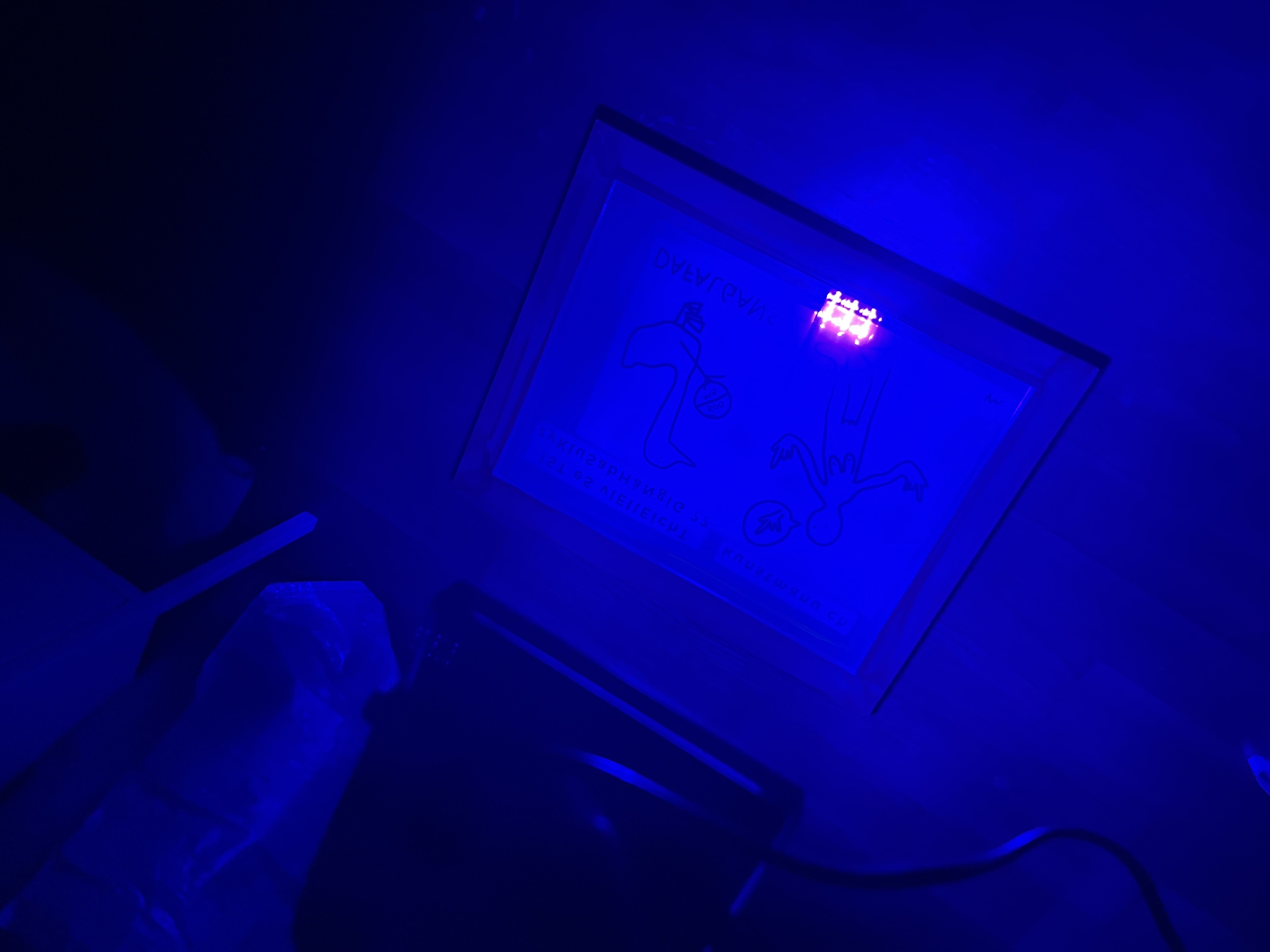 Nach dem nur halb geglückten 1. Versuch inklusive 1. Druck habe ich das Sieb komplett ausgewaschen und nun einen neuen Beschichtungs- und Belichtungsversuch gestartet. Es war ein Erfolg. 1. Beschichten mit Fotoemulsion unter Gelblicht 2. Motive positionieren 3. Belichten unter UV-Licht 4. Auswaschen 5. Freude<3